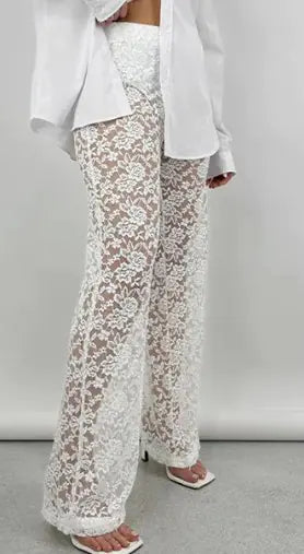 - Summer Lace See-Through High Waist Stitching Long Straight-Leg Pants